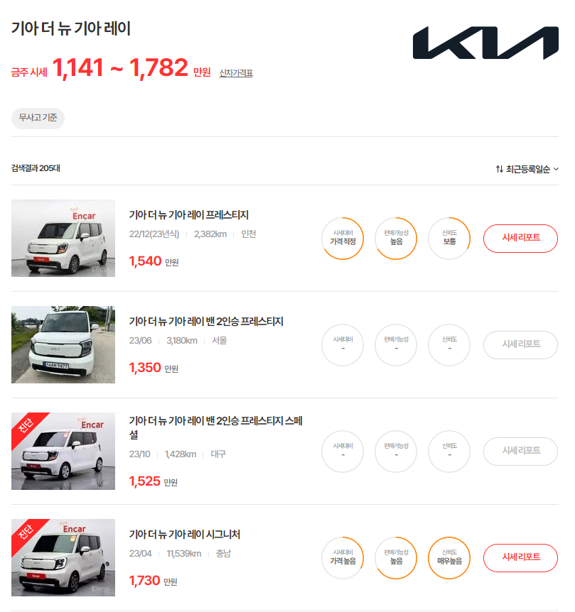 22~24년식 더 뉴 레이 중고차 시세는 1141~1782만원입니다. 출시된지 얼마 안된 모델이라 주행거리도 짧고 신차가와 차이가 없는 모델들도 있습니다. 간혹 연식은 최신인데 주행거리가 터무니없이 많은 경우 영업용/장기렌트 차량을 의심해볼 필요가 있습니다.
