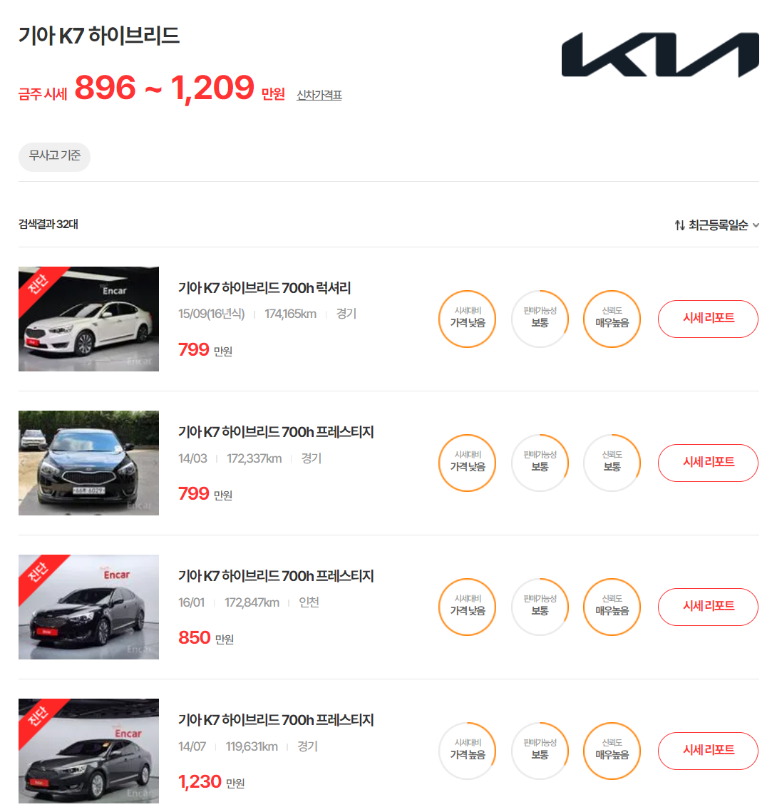 13~16년식 K7 하이브리드 중고차 시세는 896~1209만원입니다. 연식/주행거리 상관없고 하이브리드 차량 구하신다면 추천드립니다. 다만 중고 매물이 그리 많진 않아서 눈여겨 보셔야 합니다.