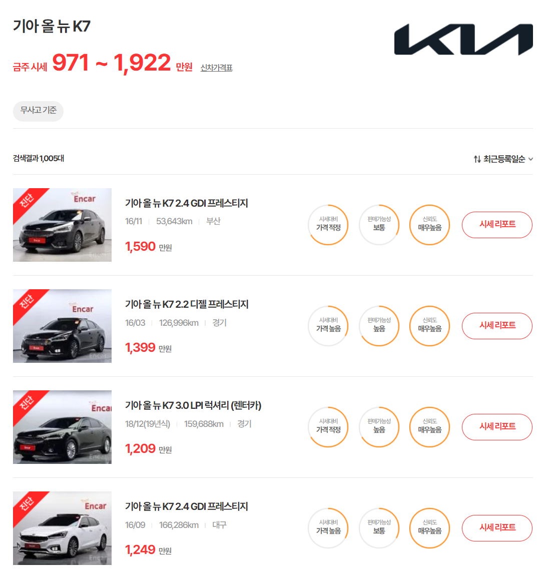 16~19년식 올 뉴 K7 중고차 시세는 971~1922만원입니다. K7 중고 매물 중 가장 많습니다. 엔카에만 약 1300여대가 등록되어 있습니다. 위에 19~21년식은 비교적 최근이라 가격대가 1천 후반대에서 시작한다면, 16-19년식 K7은 1천 초반에도 괜찮은 매물을 구하실 수 있습니다.
