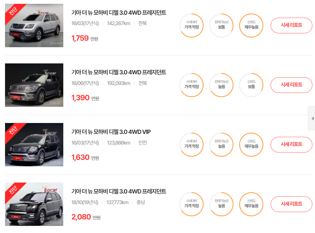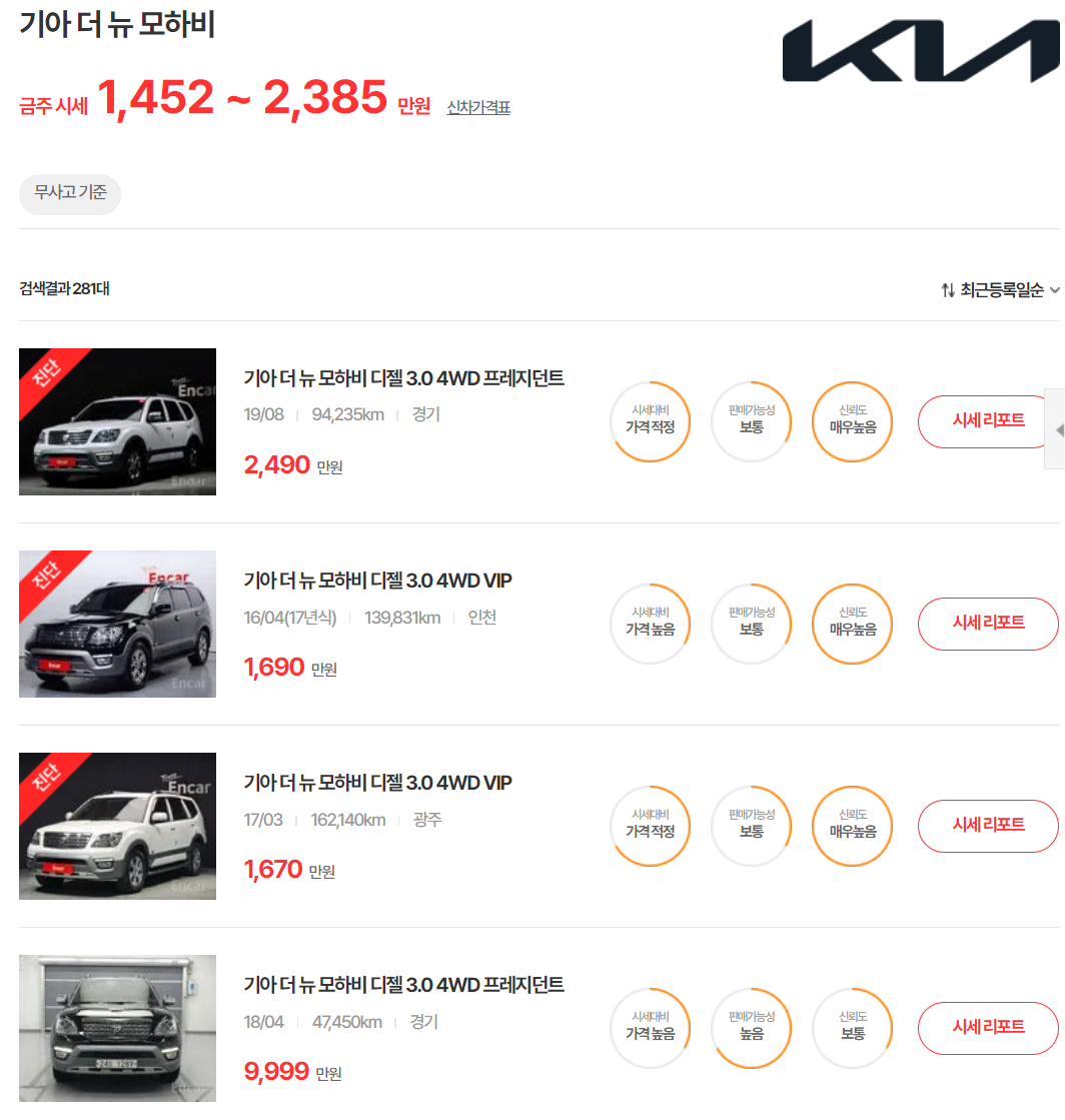 아래에서 모하비 연식별 중고 시세를 알아보겠습니다.