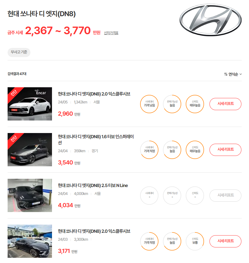 23~24년식 쏘나타 디엣지 중고차 시세는 2367~3770만원입니다. 신차가는 2855~3893만원입니다. 연식이 얼마 안된 모델은 렌트카가 중고 시장으로 넘어오는 경우가 있으므로 매매사이트에서 꼼꼼히 확인할 필요가 있습니다.