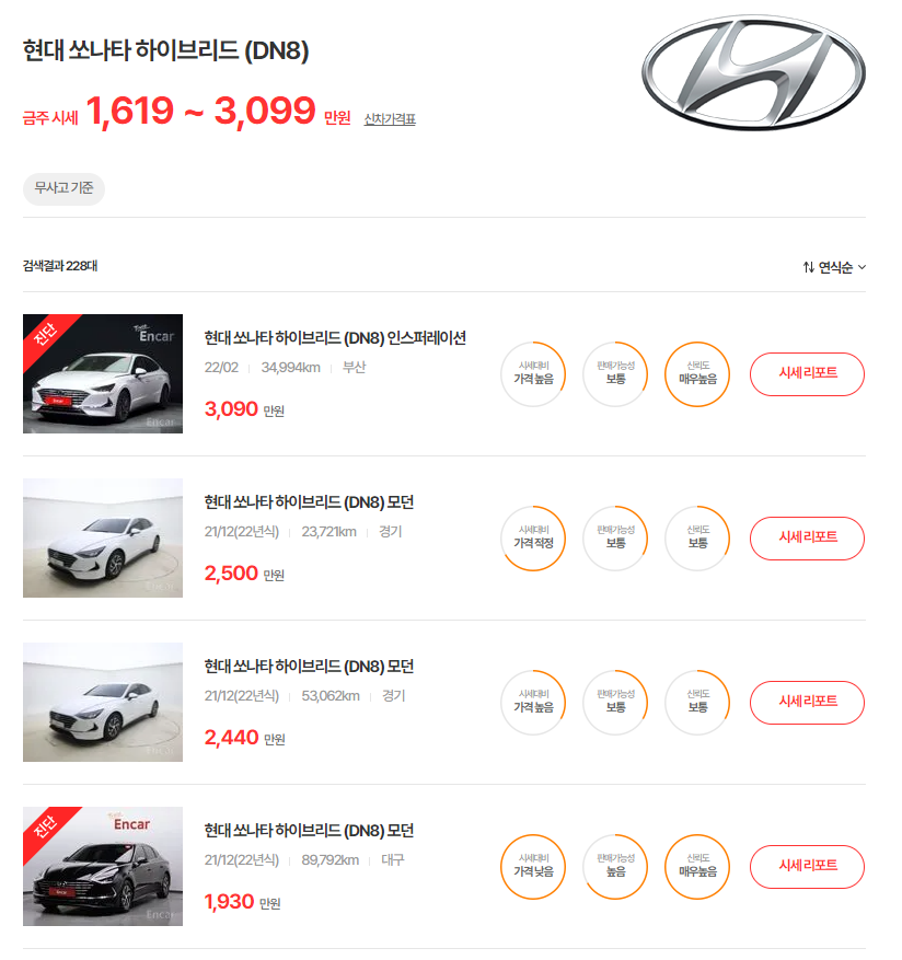 19~23년식 쏘나타 하이브리드 중고차 시세는 1619~3099만원입니다. 트림별 가격차이가 상당히 크며, 유지비 연비 생각하면 하이브리드 중고가 낫지않나 싶네요.