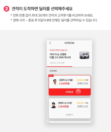 국내 최대 중고차 매매사이트 엔카에서 내 차 견적을 뽑아볼 수 있습니다. 번호판만 등록하면 내 차 정보를 토대로 경쟁 입찰이 실시간으로 진행됩니다. 최대 30개의 딜러 견적을 받을 수 있으며 그 중에서 마음에 드는 딜러를 선택하여 차량 점검 및 판매를 결정할 수 있습니다.