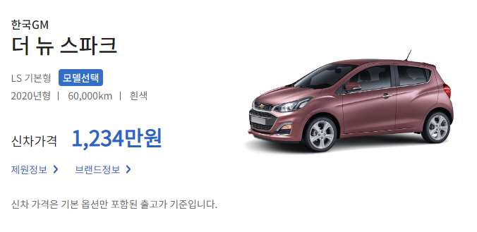 모델, 세부등급, 주행거리, 색상, 연식까지 하나하나 골라주시면 시세 및 감가, 잔존가치까지 한번에 알아볼 수 있습니다. 2020 스파크 6만키로 흰색 차량의 가격은 702만원으로 나오고 있습니다. 신차가 1234만원인데 1년 감가 약 150정도로 잡으면 되겠네요.
